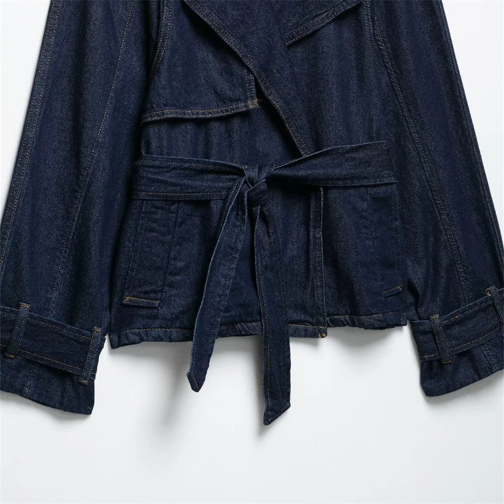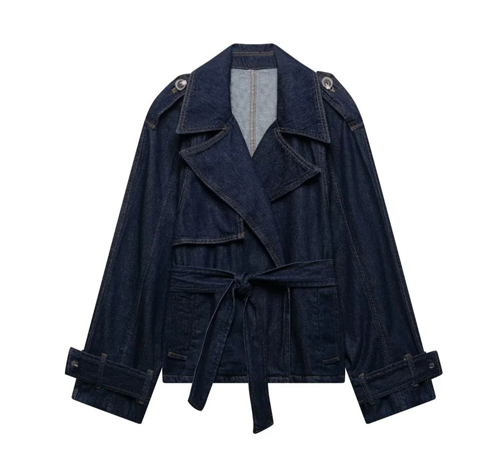 Unendo lo street style moderno alle linee di un classico trench, questa giacca in denim ha un look unico e audace. La cintura annodata in vita esalta la figura, mentre l'ampio colletto e le cuciture dettagliate aggiungono un tocco sofisticato.